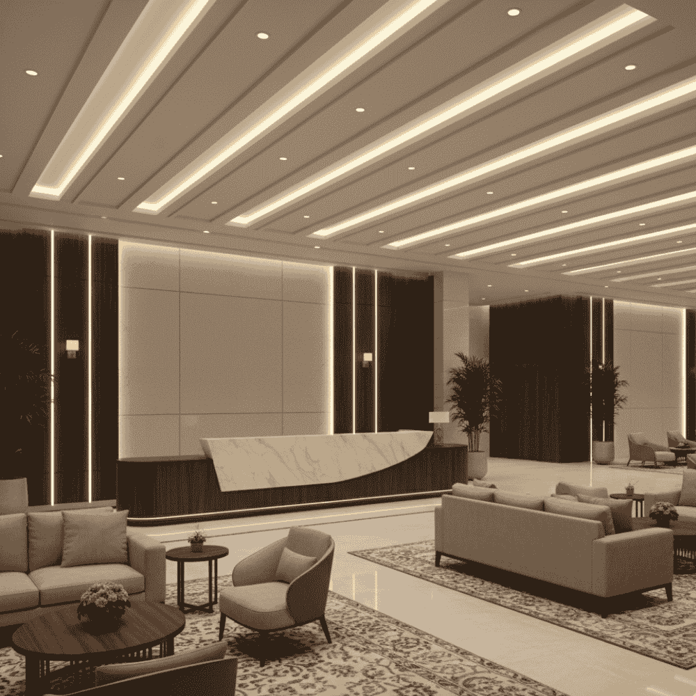 Gypsum ceilings with indirect lighting combine style and functionality. Hidden LED strips provide a warm, ambient glow that highlights architectural features while giving a clean, contemporary appeal.
